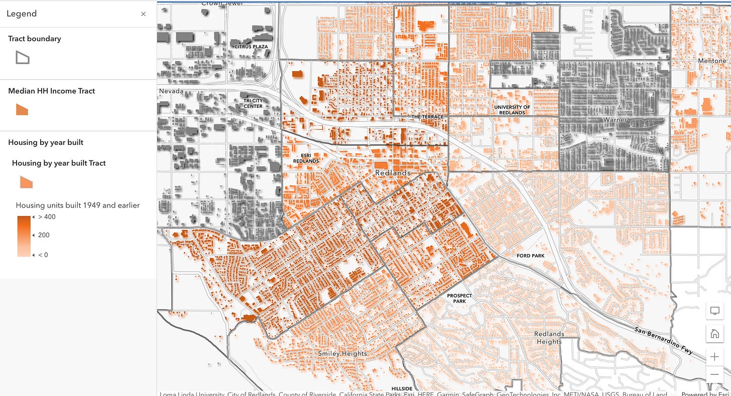 This map shows that neighborhoods around Olive Ave and Fern Ave, as well as neighborhoods between Colton and Lugonia, have a high number of older homes and household incomes that qualify for energy efficiency rebates. Click on the map to interact.