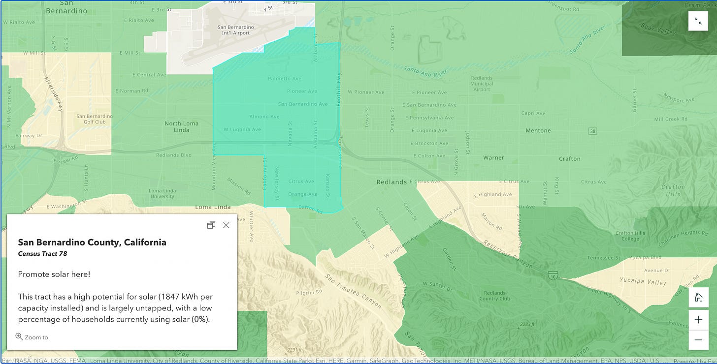 The darker green areas have the lowest usage and most potential. For example, areas in North East Redlands have both high potential for solar energy and low adoption. Click map to explore more.