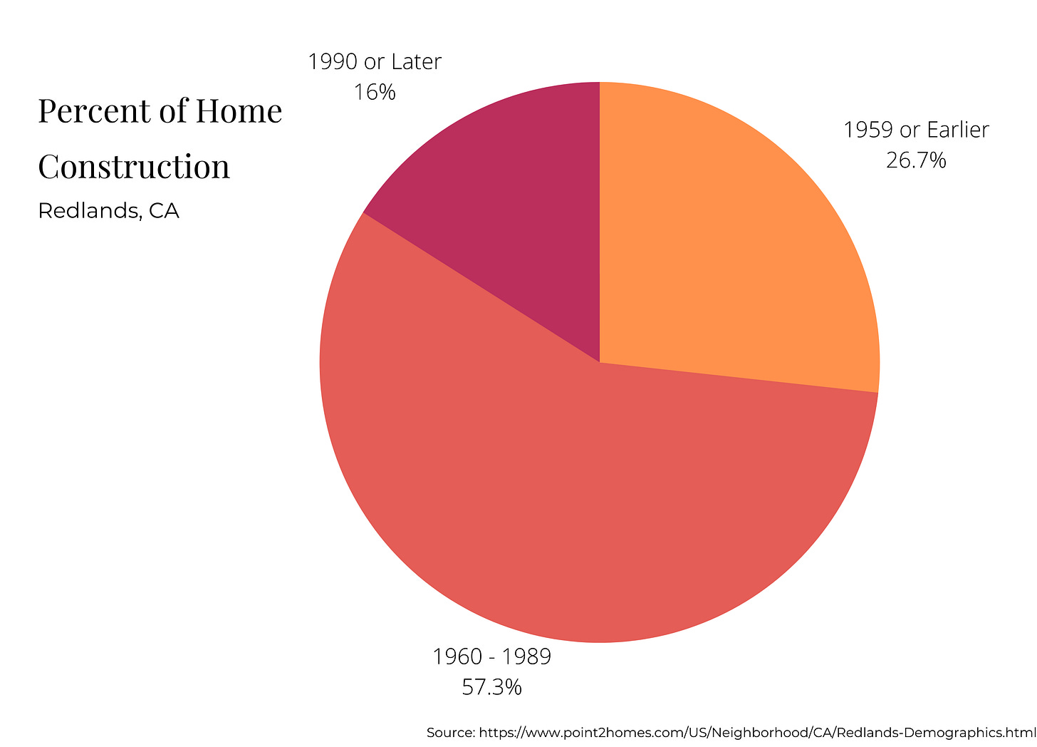 According to the Energy Information Administration, homes built after 2000 use 15% less energy per square foot than homes built in the 1980s and nearly 40% less energy than homes built before 1950. There is a large opportunity for retrofitting in Redlands with nearly 85% of homes built before 1990.