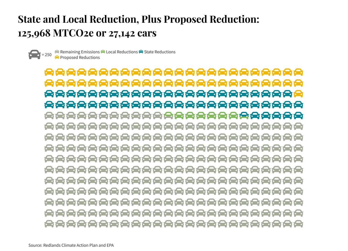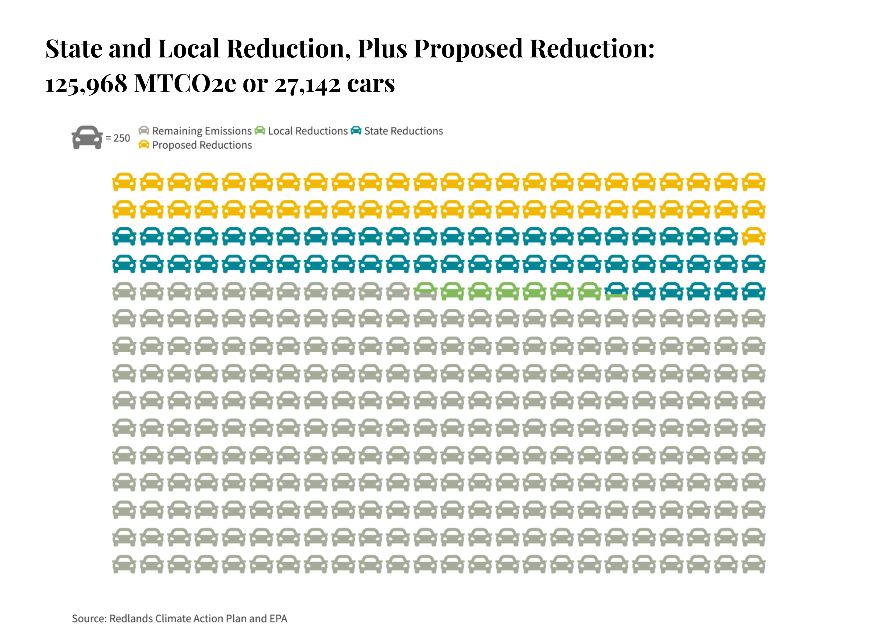 That’s equivalent to removing 27,142 cars off the road for 1 year or 30% of Redland’s 2015 emissions.