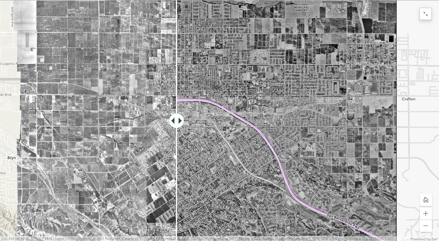 Left: Aerial Redlands 1960 Right: Aerial Redlands 1994 with highlighted purple line in the path of Interstate 10. Click the map to explore more in Story Maps.